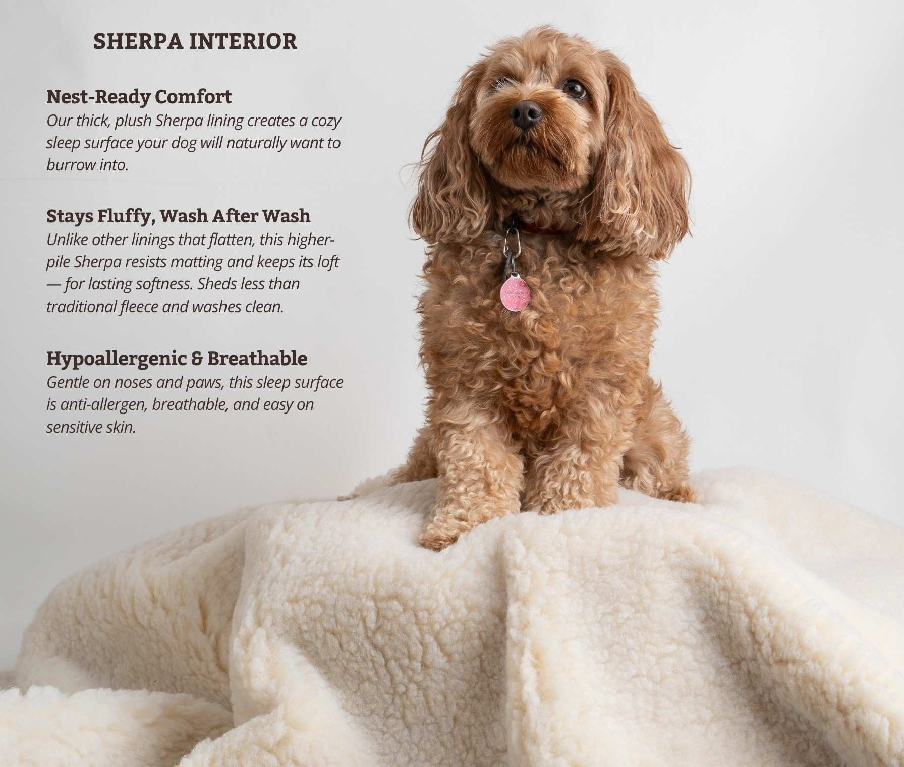 Unlike standard linings that flatten or wear out, our Sherpa is heavier, more durable, and designed to maintain its plush feel over time. It’s hypoallergenic, sheds less, and resists matting — staying fluffier longer so your dog always has a clean, cozy spot to rest.